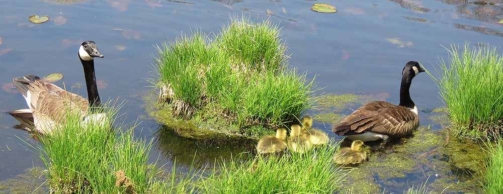 At Cranberry Bog, the Canada Goose (Branta canadensis) goslings and their parents were feeding near the parking lot. Four of the five pictured. One lagged behind; too busy eating.