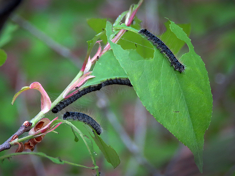Gypsy Moth (Lymantria dispar) caterpillars have just hatched. Look for them atop the tan egg masses (embedded with hairs from the females' body) deposited on tree trunks and limbs.