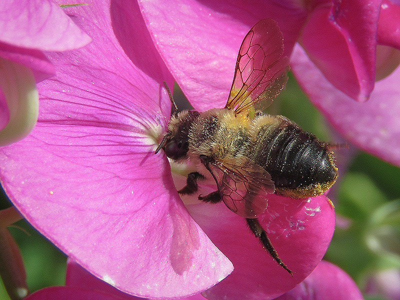 Unlike Bumble Bees that carry pollen on their hind legs, Leaf-cutters carry pollen on the underside of their abdomen.