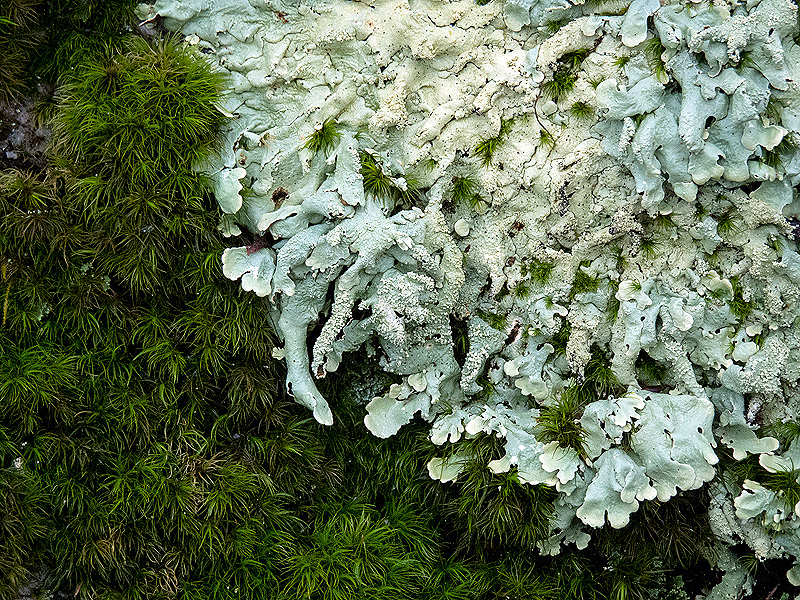 Lichens, mosses, and ferns offer some welcome color.