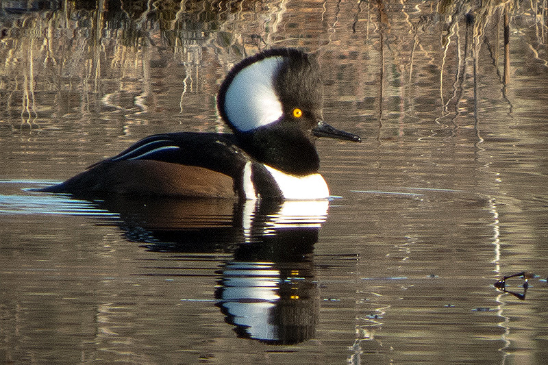 A lone male Hooded Merganser (Lophodytes cucullatus), crest up displaying far out on the marsh.