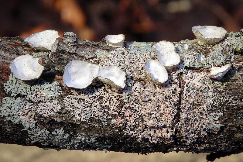 ...Blister Lichen (Physcia stellaris) with grey/black fruiting bodies (Apothecia).