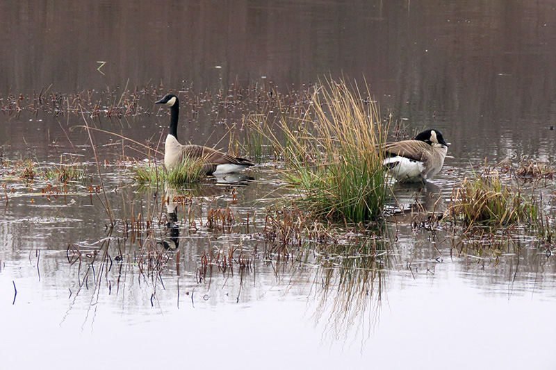 Canada Geese (Branta canadensis) hanging out in the shallow water atop the site of a beaver lodge last active 15+ years ago.
