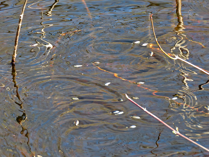 At Raymond Brook Marsh, lots of Whirligig Beetles (Family Gyrinidae, Dinutes sp.) on the surface.
