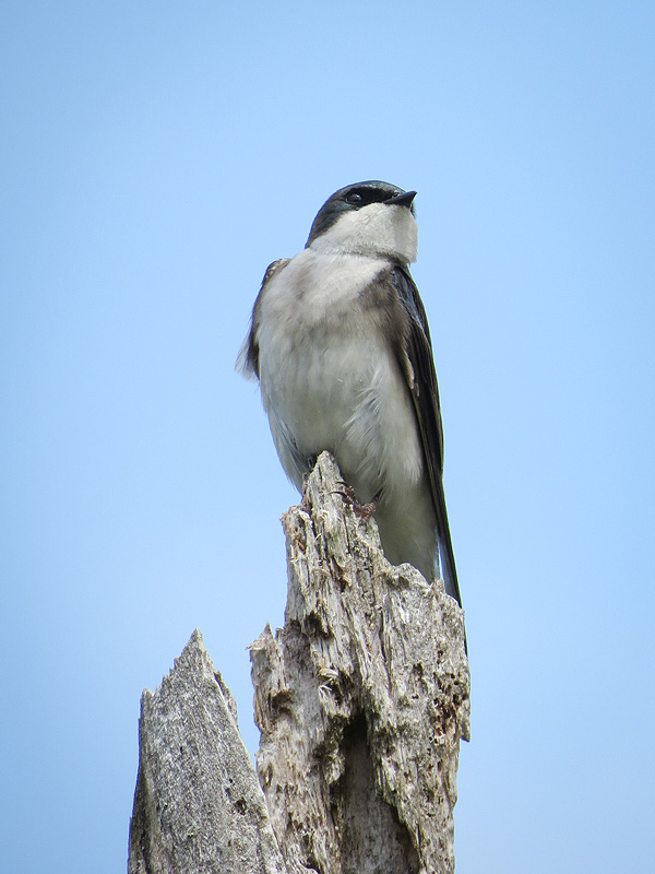 About 50 feet east of the bench, I noticed a dead tree with lots of woodpecker damage - and this female Tree Swallow (Tachycineta bicolor) sticking out of one of them.