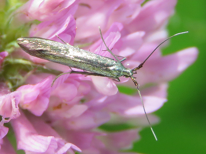 A chrome-plated moth. How cool is that! It's a Casebearer Moth (Coleophora sp.)...