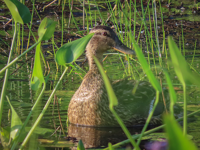Two of four or five Mallard (Anas platyrhynchos) ducklings racing away from me towards cover.