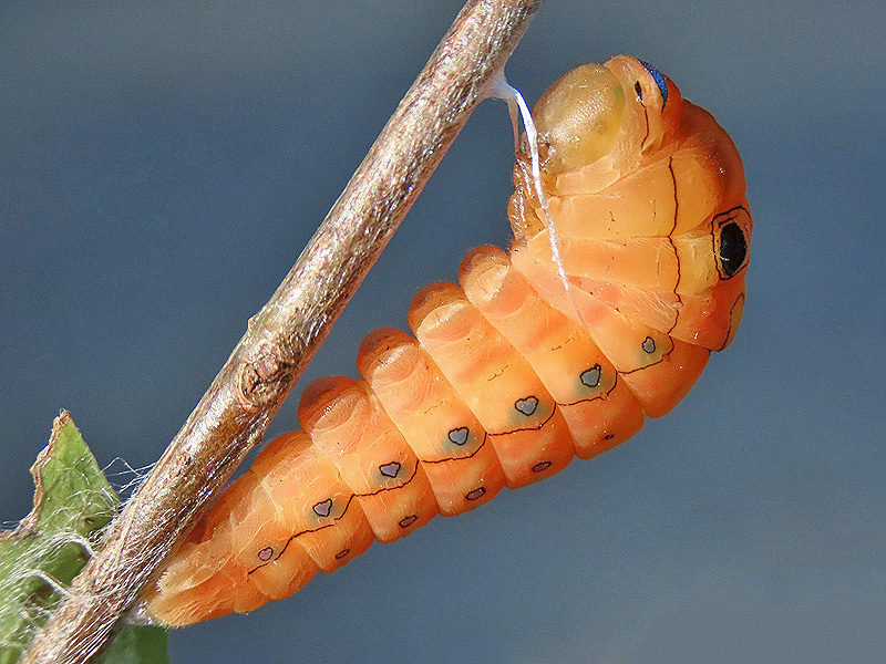 The Spicebush Swallowtail (Papilio troilus) caterpillar is done feeding, has evacuated its gut, turned color, spun a silken girdle and tail end button, and will soon shed its skin to reveal a chrysalis inside.