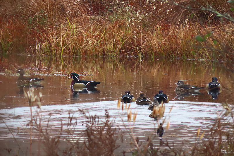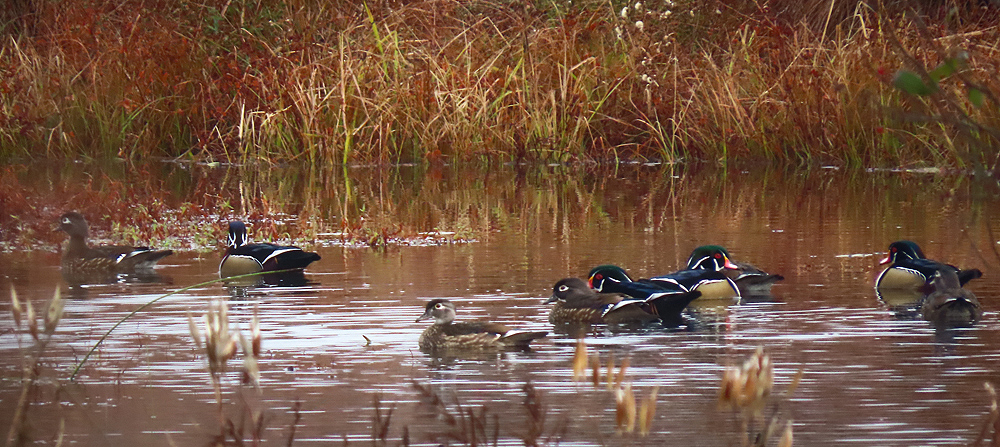 Eight Wood Ducks (Aix sponsa) in pairs.