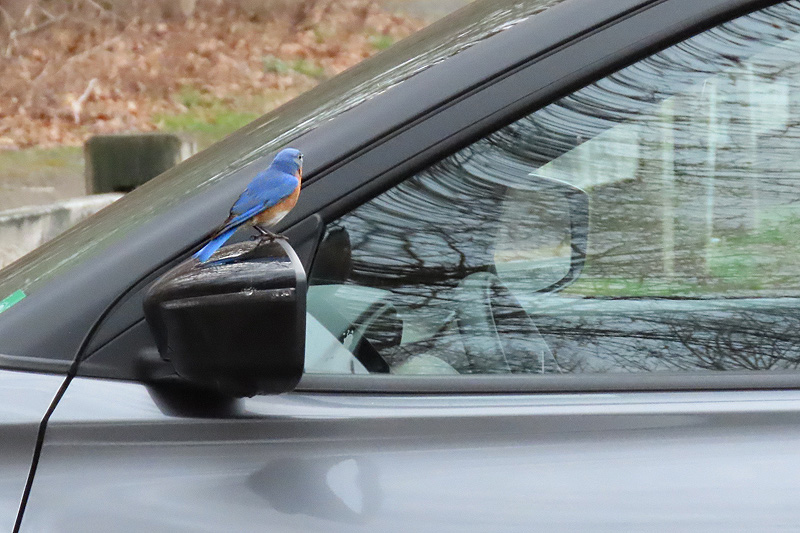 March 31st. A male Eastern Bluebird (Sialia sialis) perched on a car's side mirror...