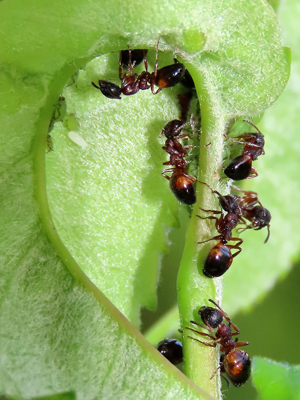 At the left, you can see some aphids. (I don't know what the white cylinder is.) I've noticed some cut holes in the leaf. Aphids pierce and suck so not their work. Maybe the ants are harvesting leaf tissue that has absorbed the aphids' honeydew?
