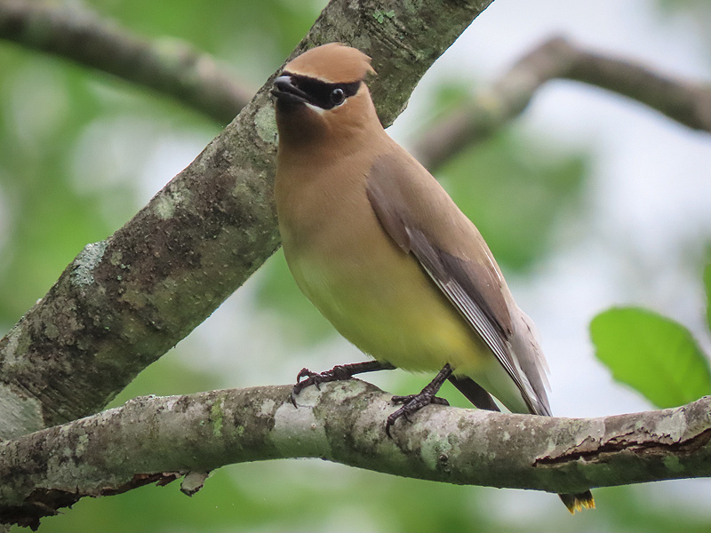 June 19th. Ah, the nest I saw being checked out by a pair of Cedar Waxwings (Bombycilla cedrorum) a week or so ago is now occupied. Waxwing's distinctive head...