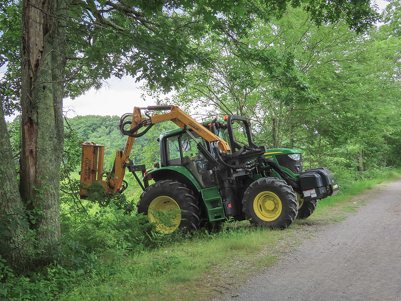 At Raymond Brook Marsh I chatted with the operator of this mower. He'd found that it was too large for the job of the day, trimming back the overgrown trail margins. He will be back with a more suitable machine. I asked him to be conservative, but to widen the trail enough at the western end of the marsh to allow social distancing - and also control the Tick Trefoil which attaches its seeds to passers-by and their dogs.