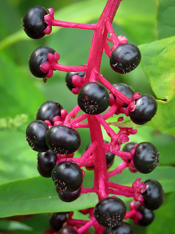 Pokeweed (Phytolacca americana) buds, flowers, and developing fruits.