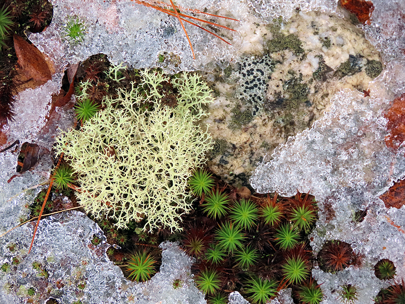 My destination was a spot I knew held various mosses and lichens. I was hoping there would still be ice around them... and there was! This is a favorite, Pink Earth Lichen (Dibaeis baeomyce).