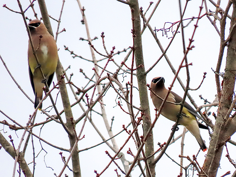 A flock of Cedar Waxwings (Bombycilla cedrorum). flew in...