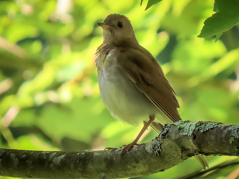 June 18th. Veery (Catharus fuscesans) in shadow. (I wasn't quick enough to catch it in the light where it was almost golden in color.)