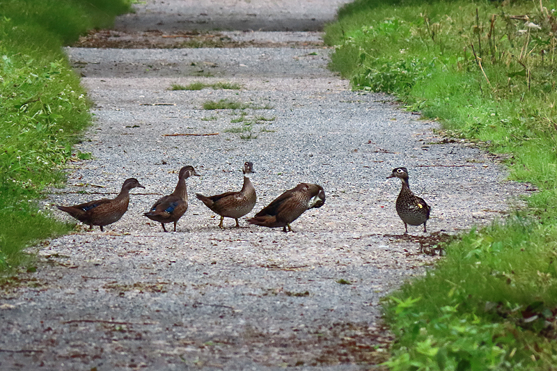 Momma Wood Duck (Aix sponsa) leading four near-adults across the trail towards the channel.