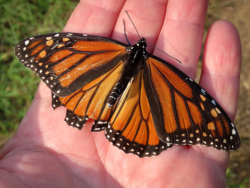 A dead female Monarch (Danaus plexippus) on the path. No obvious cause of death; perhaps the victim of a crab spider.