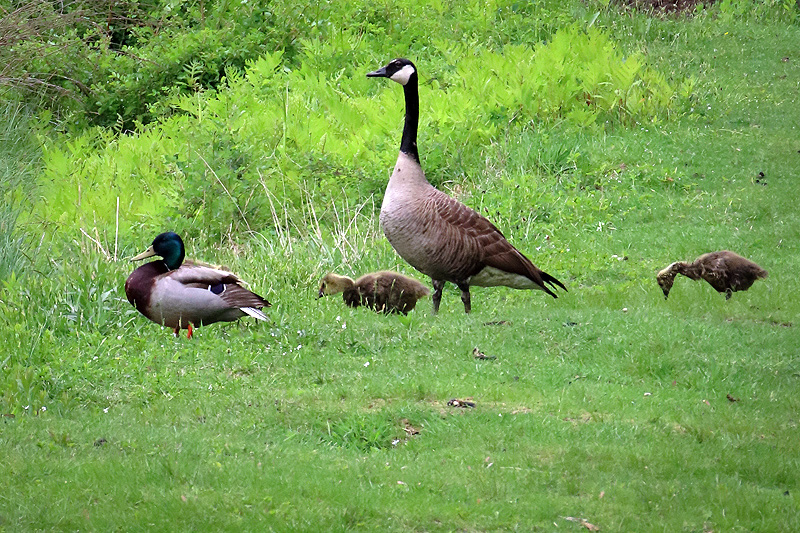 An afternoon stop at Cranberry Bog. Male Mallard (Anas platyrhynchos), Canada Goose (Branta canadensis) and two goslings.