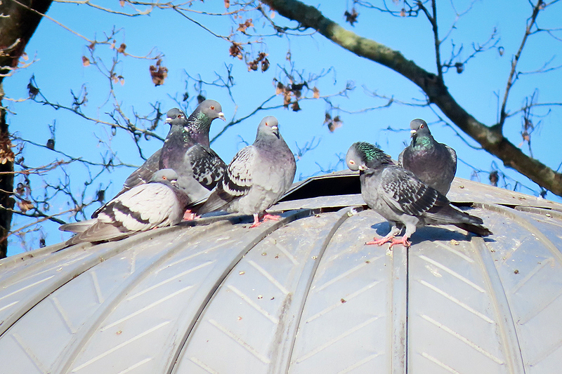 Rock Doves or Domestic Pigeons (Columba livia) gather in and around the vents atop the silo.