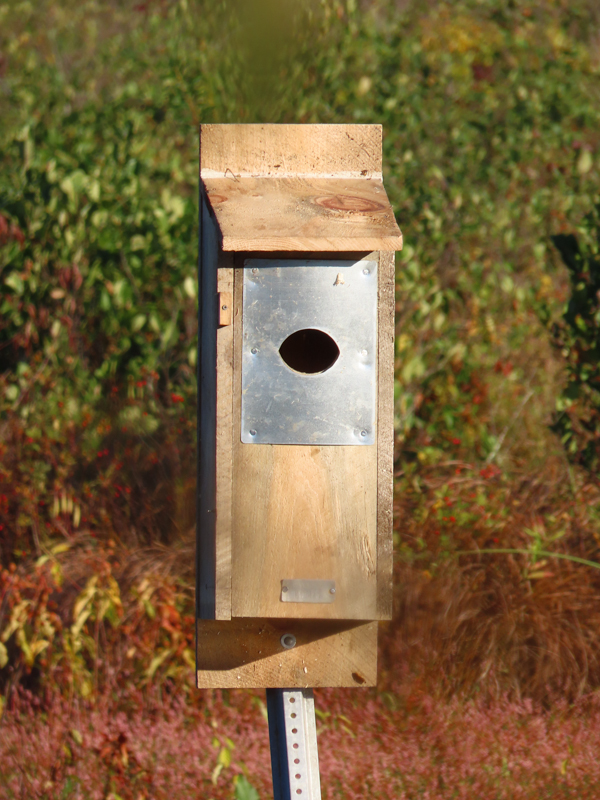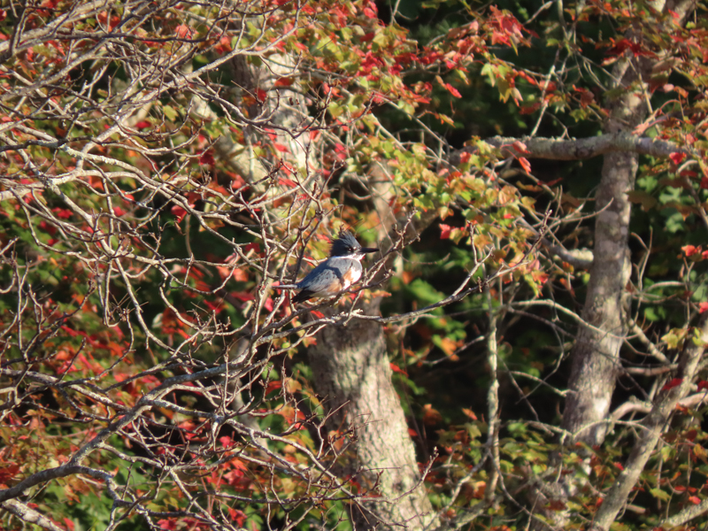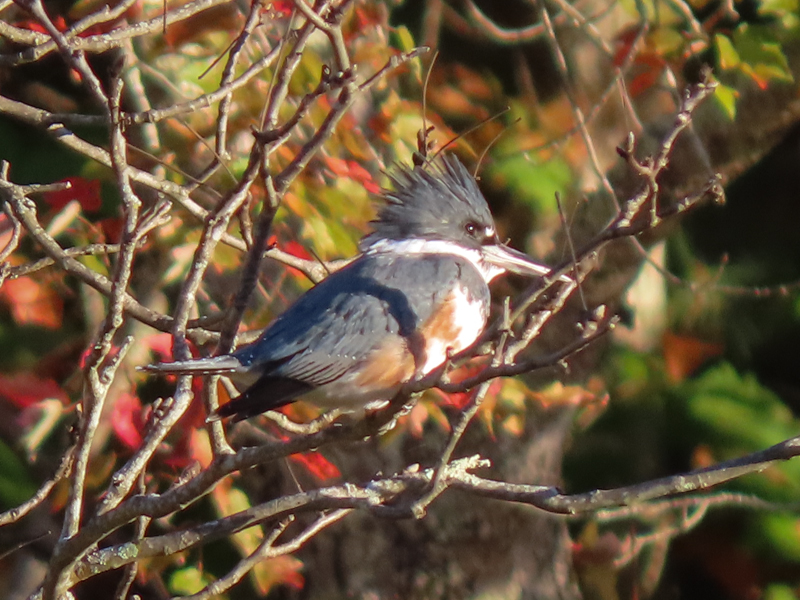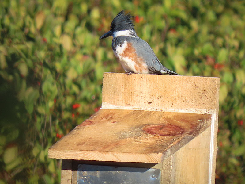 October 2nd. The female Belted Kingfisher (Ceryle alcyon) atop the new wood duck house.