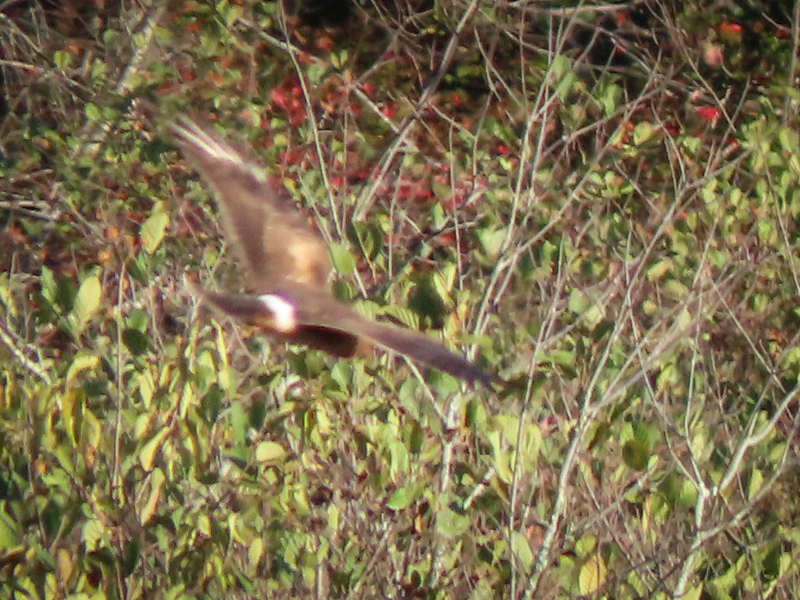 Maybe the worst picture I've ever posted. Pretty sure it's of a Northern Harrier (Circus cyaneus) based on the white feathers at the base of the tail. It was swooping back and forth, low over the marsh.