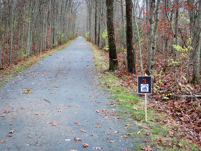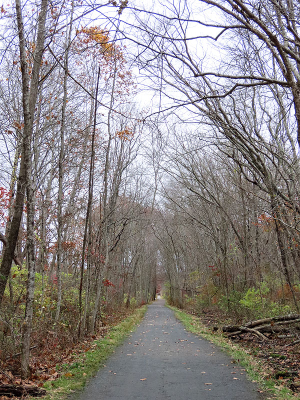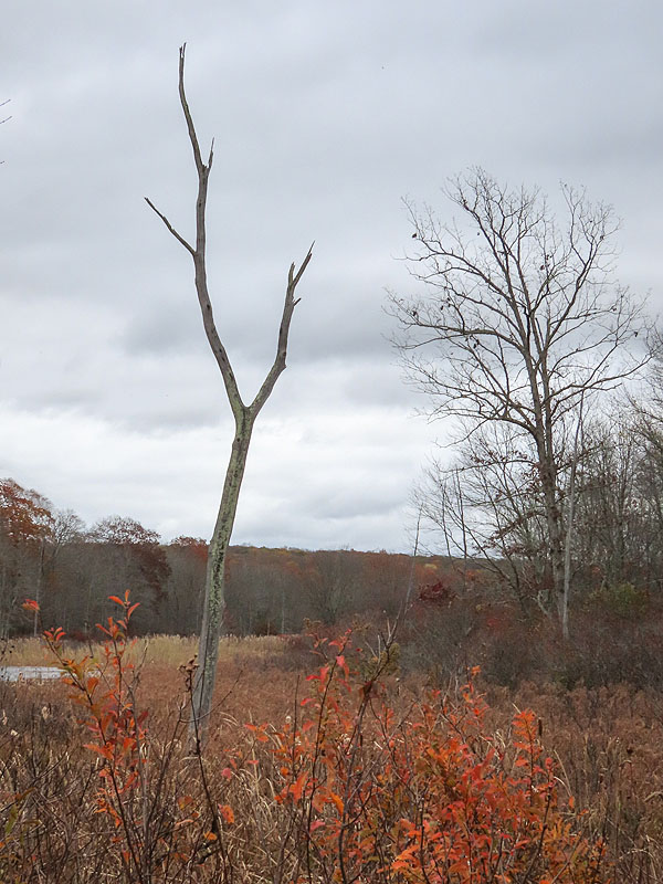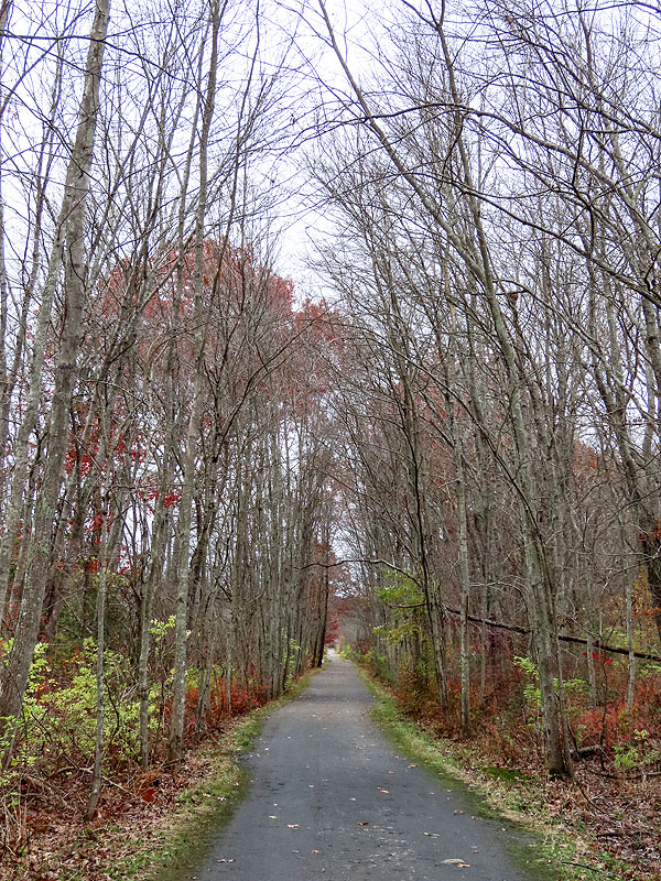 Walking east from Old Colchester Road to Raymond Brook Marsh. Trees nearly bare from High winds. Trail blown clear of leaves in anticipation of the Ghost Run half marathon on Saturday, November 1st.