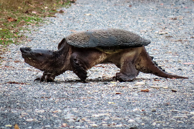 Huge Snapping Turtle (Chelydra serpentina) crossing the trail.