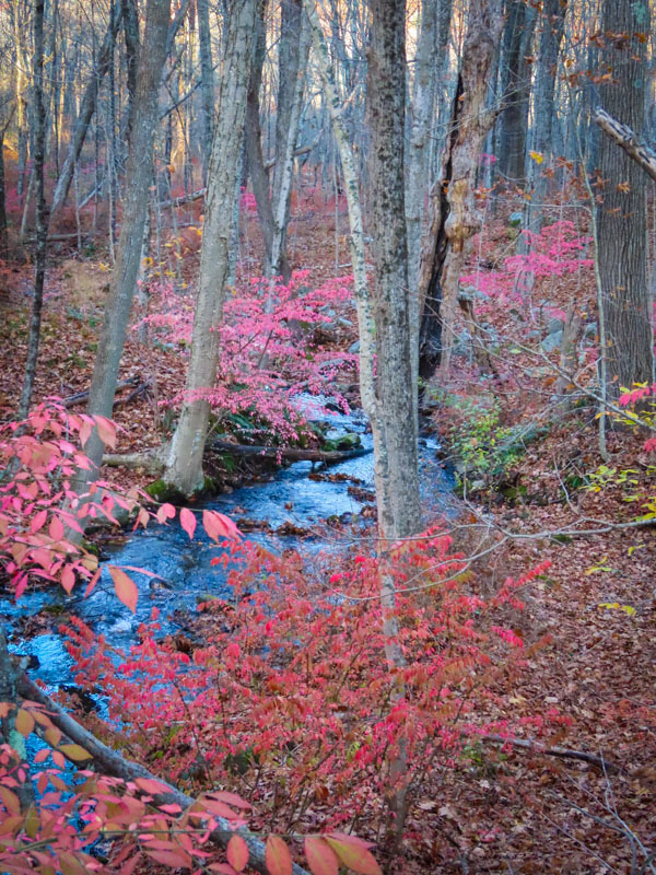 Winged Euonymus or Burning Bush (Euonymus alatus) is a HIGHLY INVASIVE shrub found in wooded areas all along the trail. Seeds are spread in bird droppings. Note the flat corky extensions along the stems - they're definitive, even when leaves are not in the dramatic Fall pink.