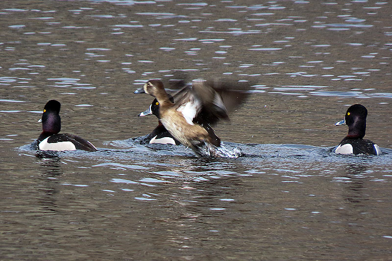 Ring-necked Ducks (Aythya collaris) at the pond east of River Road. You can actually see the maroon neck "collars" for which they're named.).