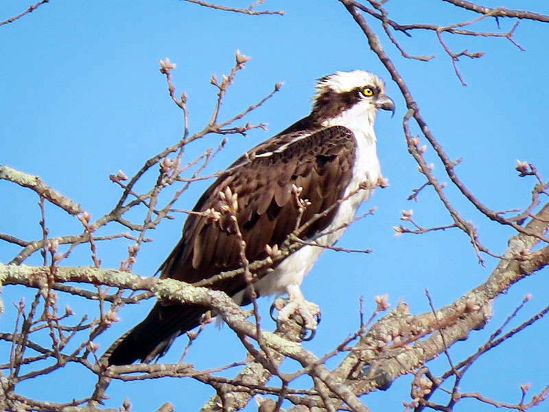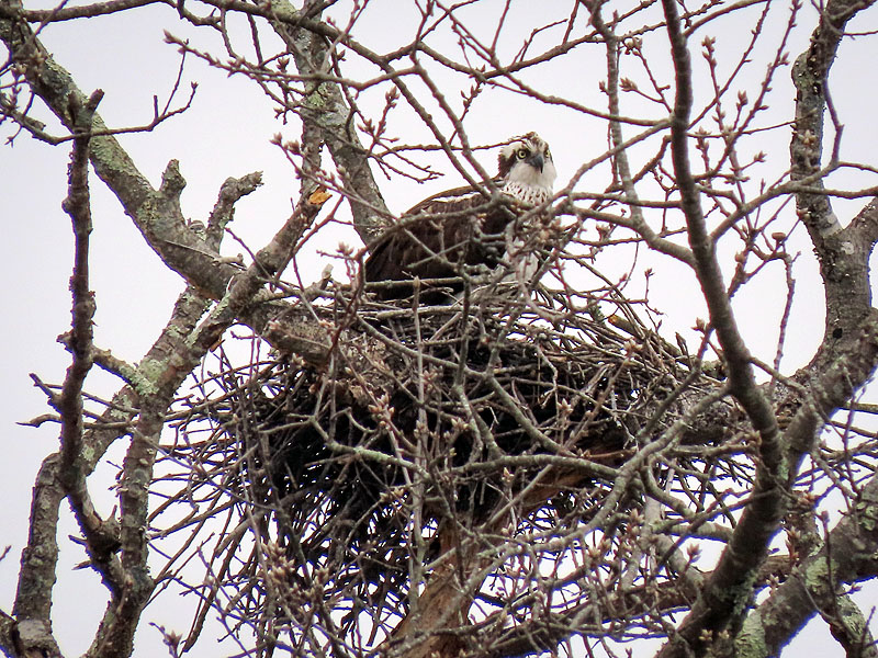 April 10th. An Osprey (Pandion halaetus) perched near to old heron nest above the pond east or Route 207.
