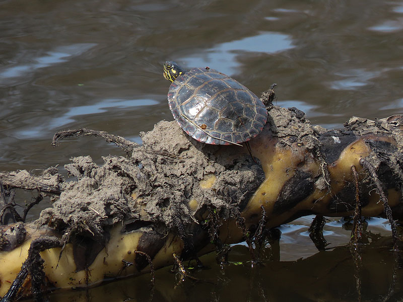 By contrast, a Painted Turtle (Chrysemys picta) soaking up the sun atop a Pond-lily rhizome.