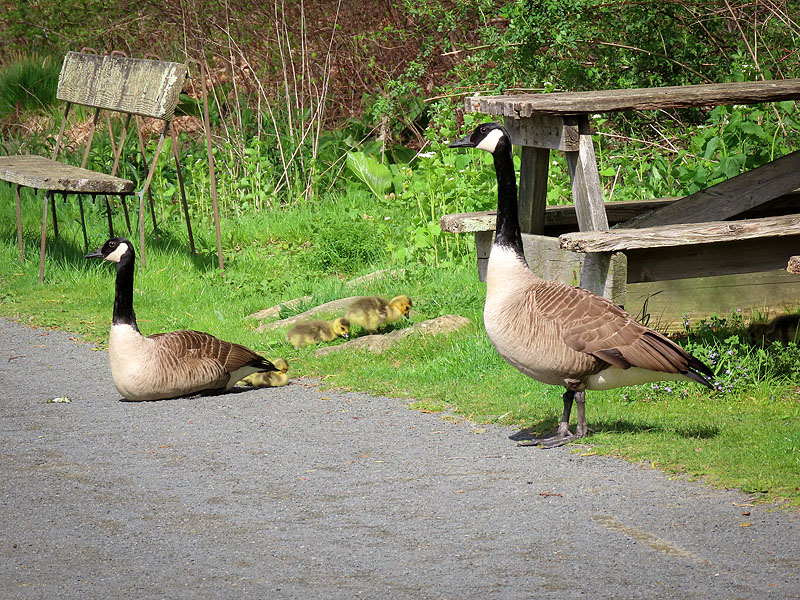 Gradually, five goslings wandered out. (Just four in this photo.)