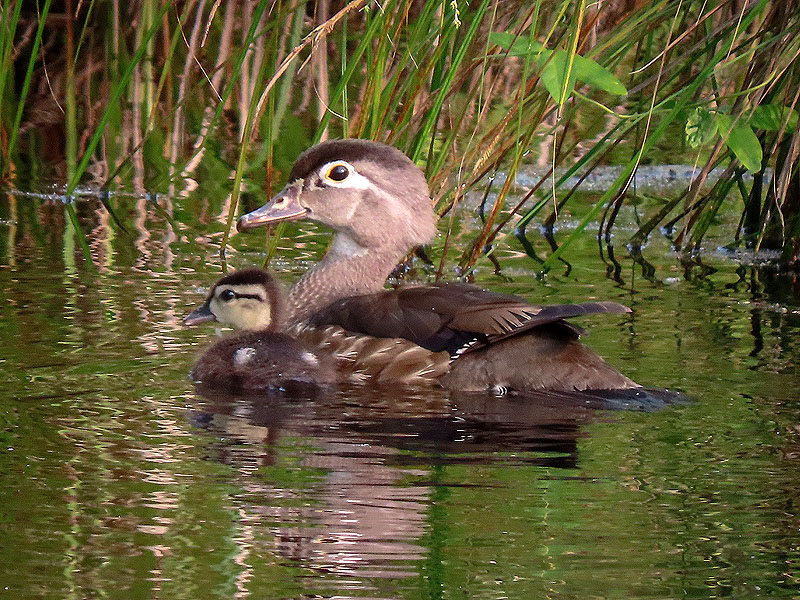 A female Wood Duck (Aix sponsa) with one of several ducklings nearby.