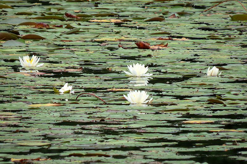 Fragrant Water-lilies (Nymphaea odorata) are blooming far across the pond.