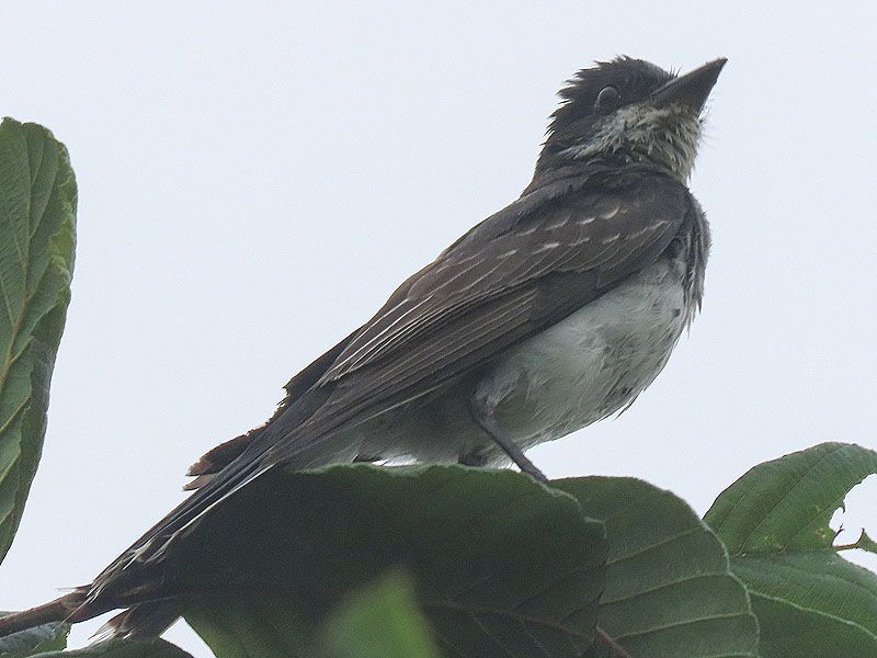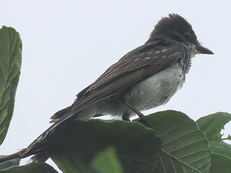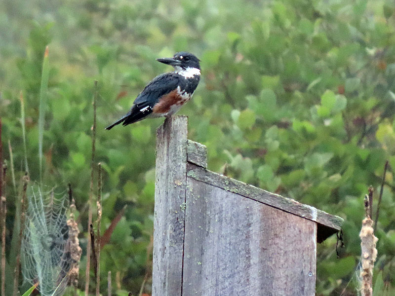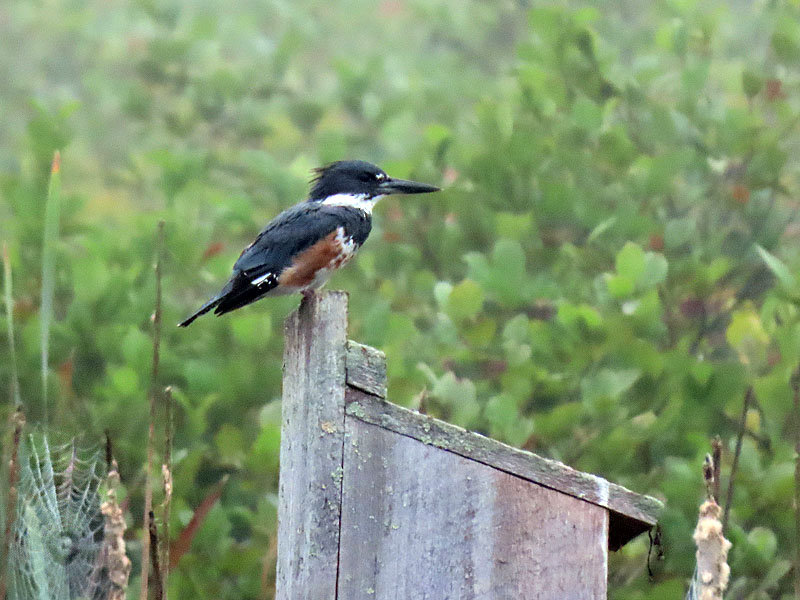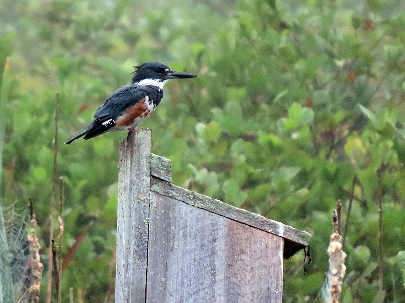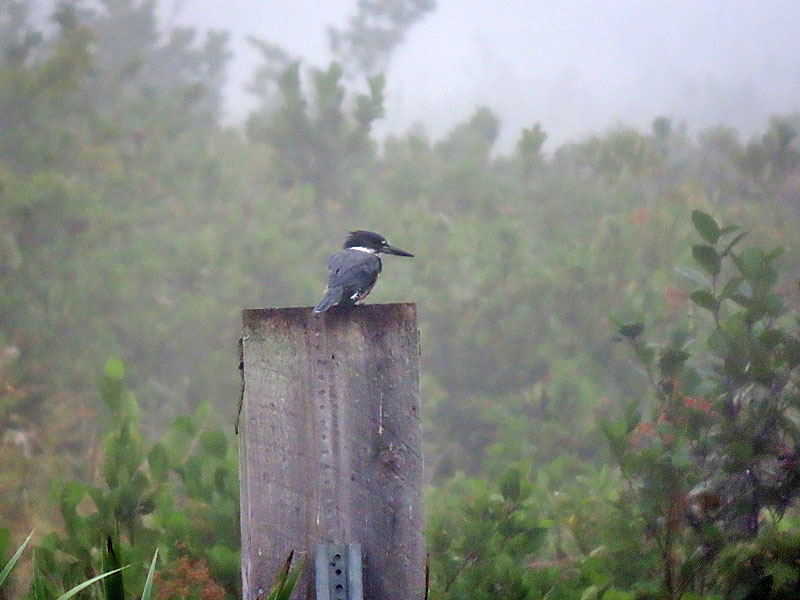 A Belted Kingfisher (Ceryle alcyon) atop the Wood Duck house in the fog.