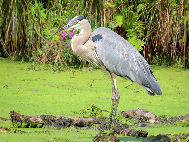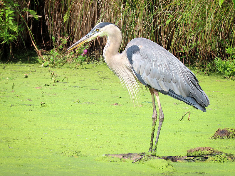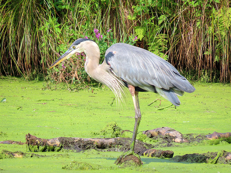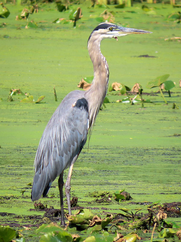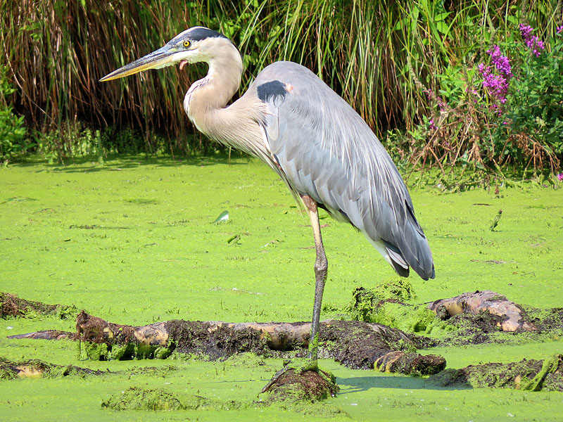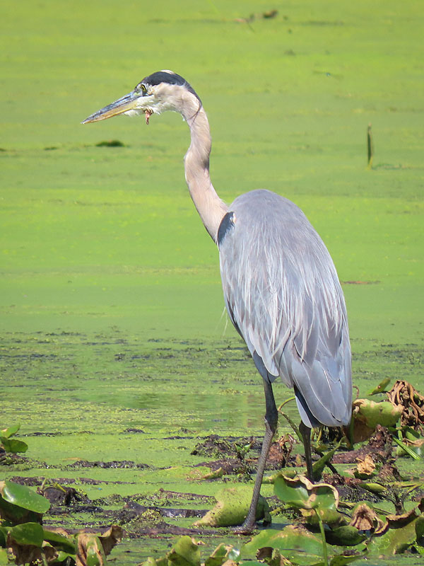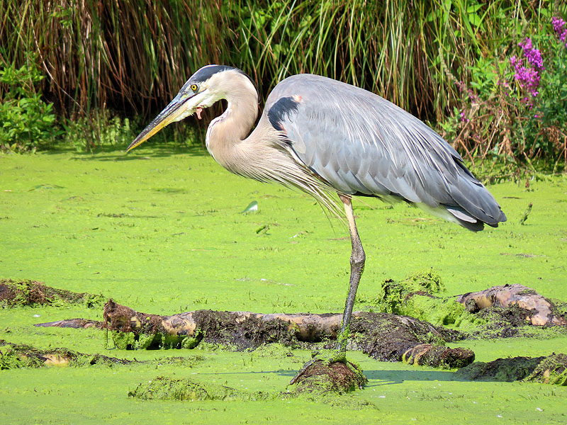The resident Great Blue Heron (Ardea herodius) with the damaged tongue and throat.