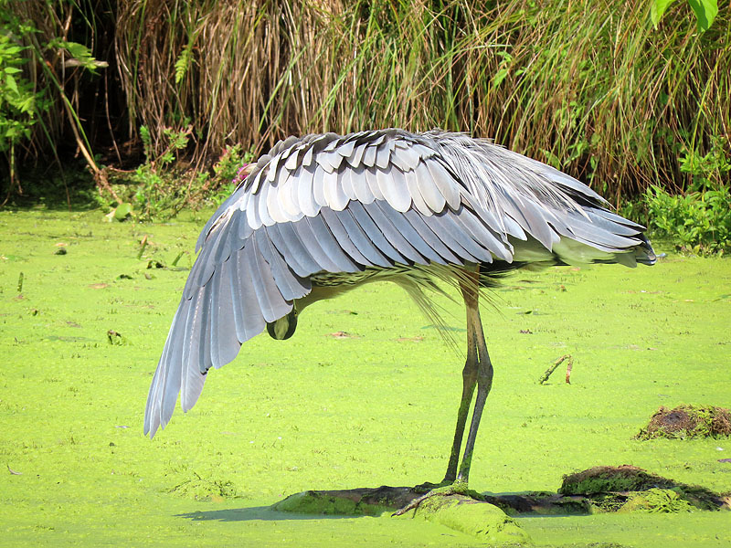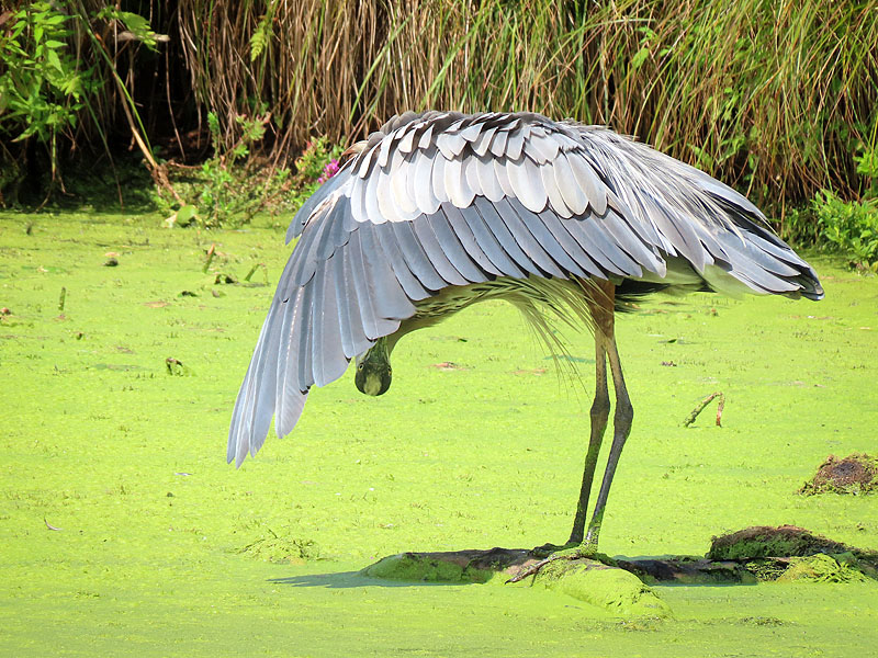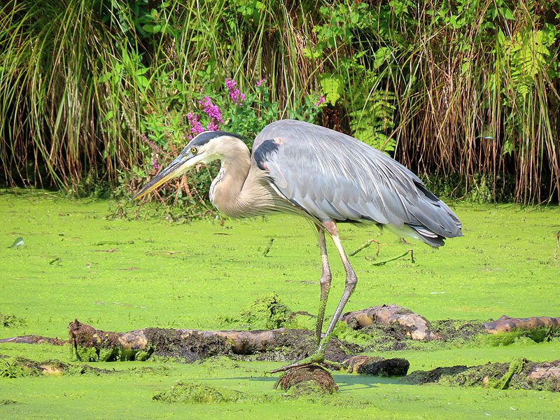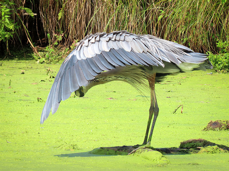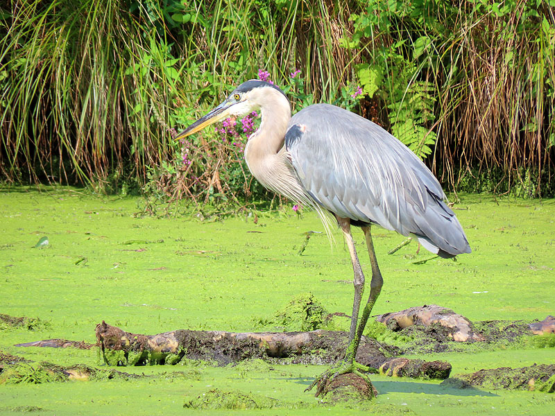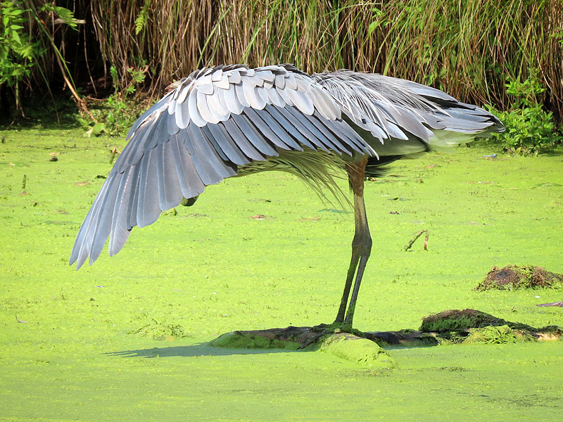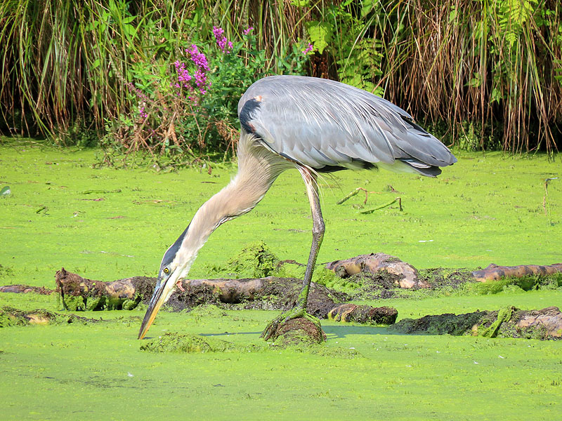 The resident Great Blue Heron (Ardea herodius) with the damaged tongue and throat.
