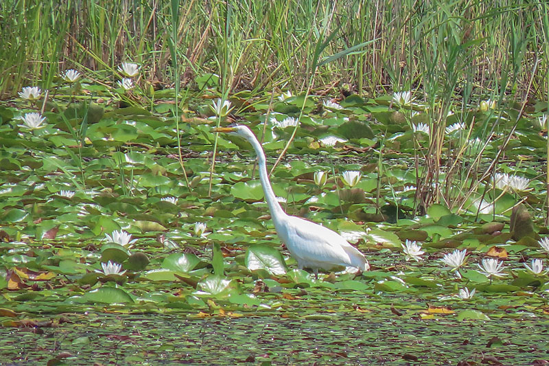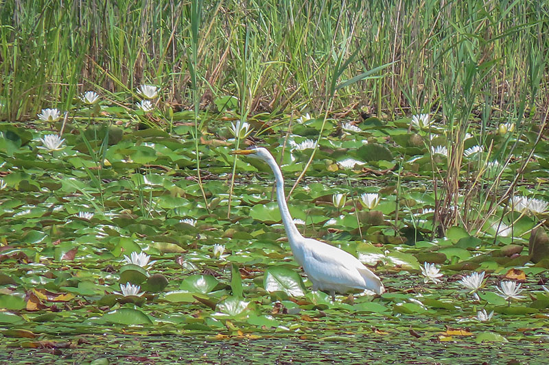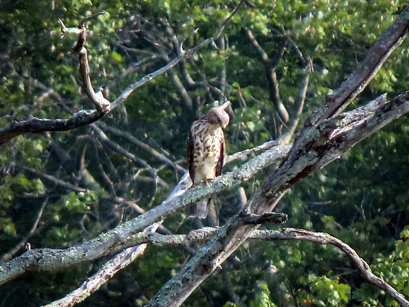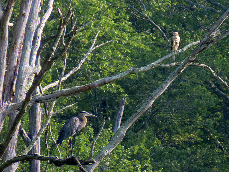August 17th. At the pond east of River Road, a Great Blue Heron (Ardea herodius) and a Red-shouldered Hawk (Buteo lineatus).