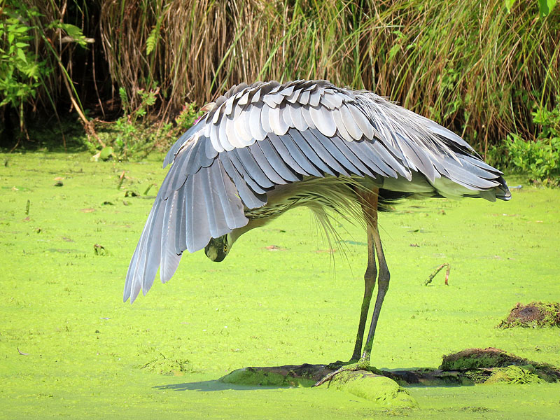The Great Blue Heron (Ardea herodius) with the damaged tongue protruding from its throat.