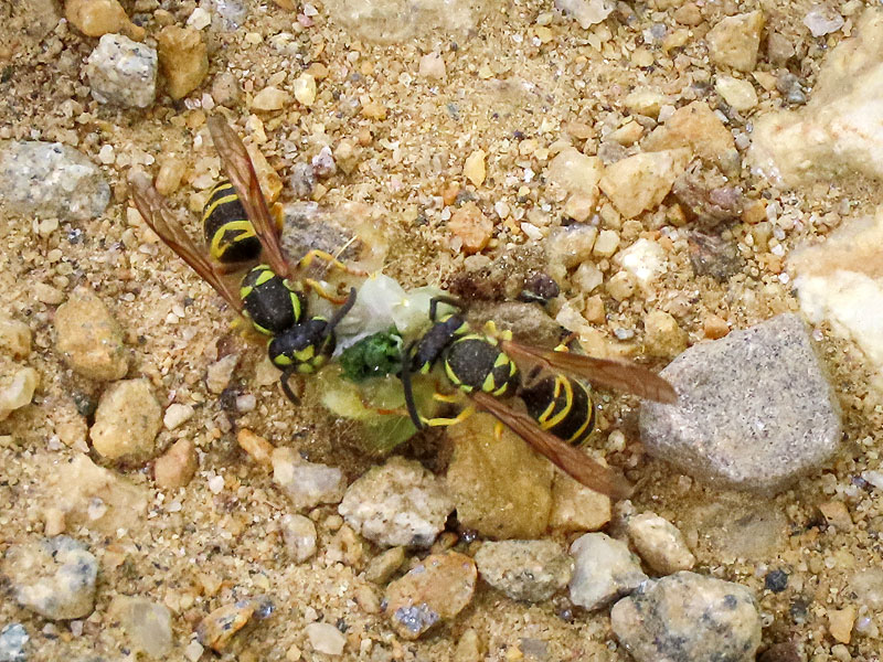Two Eastern Yellowjacket wasps (Vespula maculifrons) chewing on something unrecognizable.