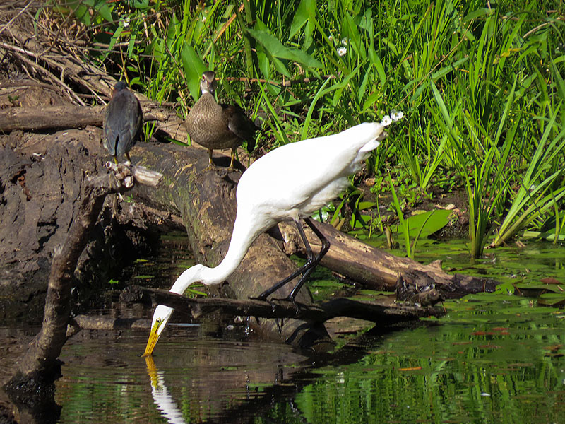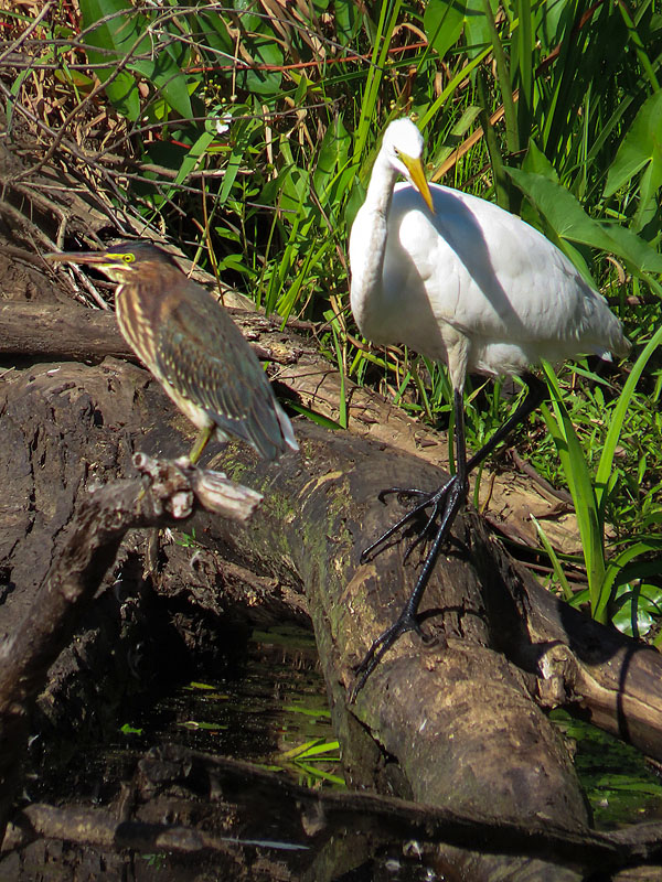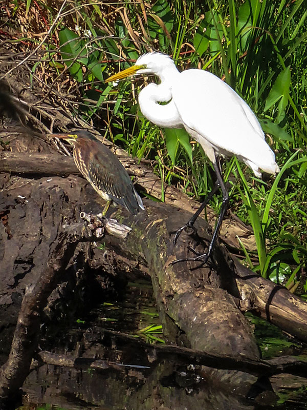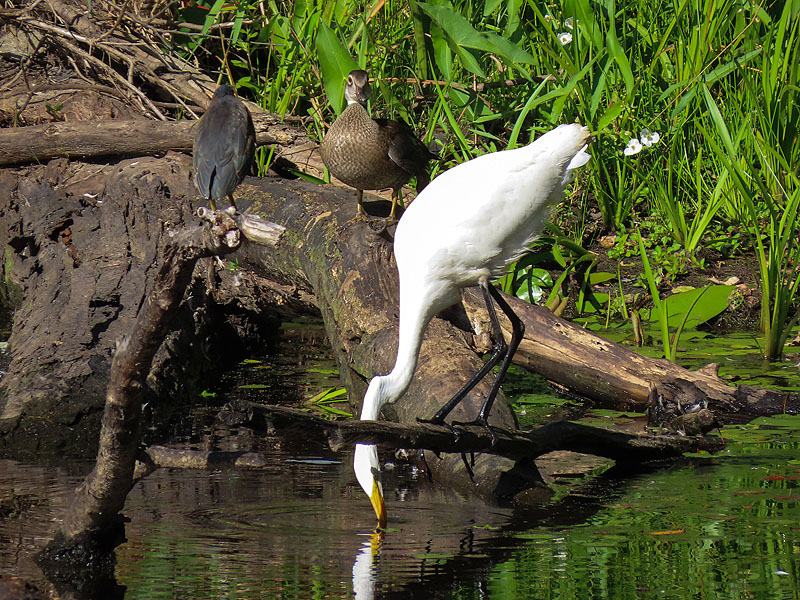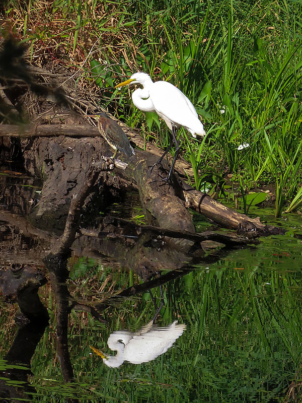 Not seen until I started editing pictures, a Green Heron (Butorides virescens) and a Wood Duck (Aix sponsa) beside the Egret.