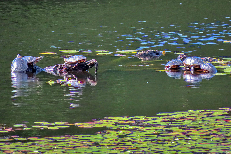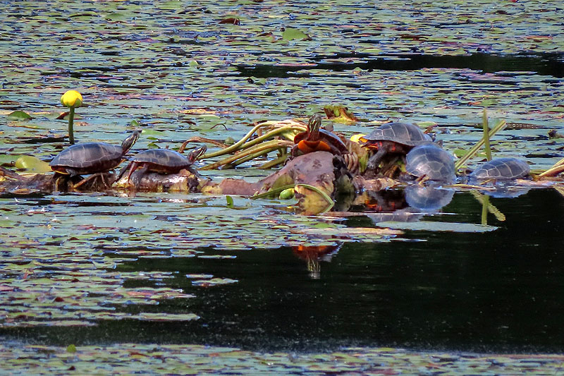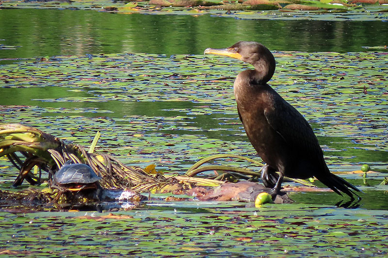 At the pond east of River Road, a Painted Turtle (Chrysemys picta) and a Double-crested Cormorant (Phalacrocorax auritus).