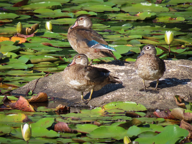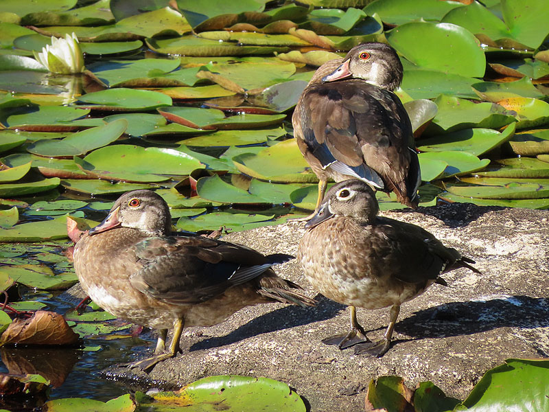 Three young Wood Ducks (Aix sponsa) - two red-eyed males and a female.