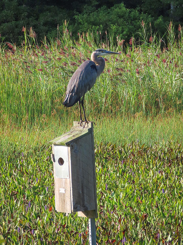 August 27th. Great Blue Heron (Ardea herodius) atop the south side Wood Duck box at Raymond Brook Marsh.
