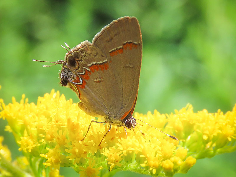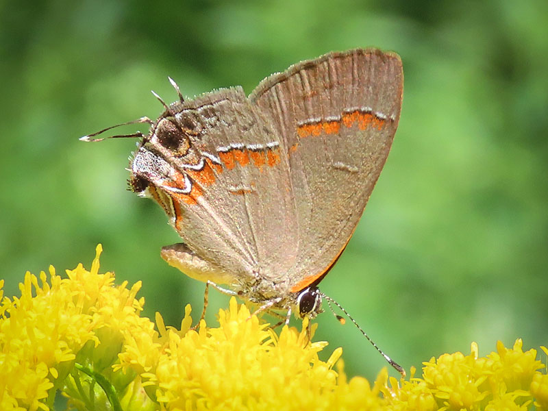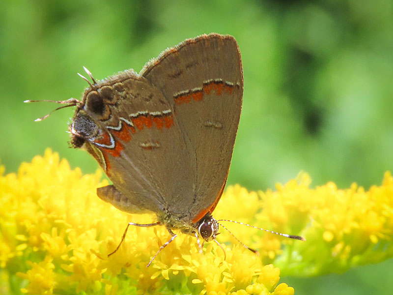 A Locust Borer (Megacyllene robiniae) at the left, but the star of the show is the Red-banded Hairstreak (Calycopis cecrops) at the right.