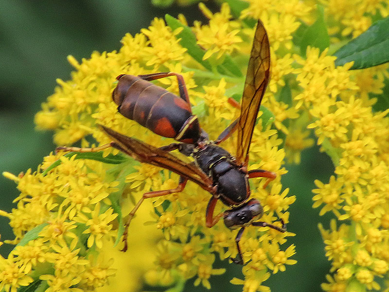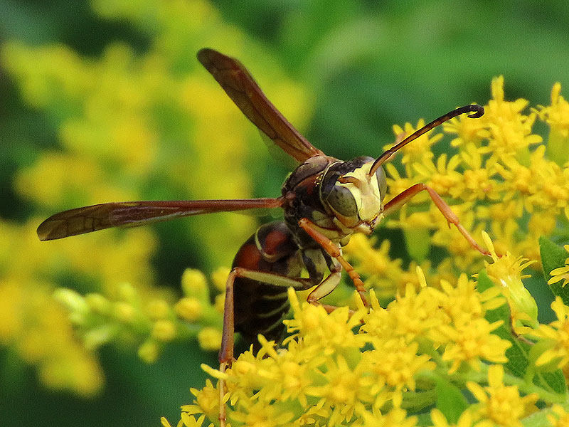A male Northern Paper Wasp (Polistes fuscatus). Males have a yellow face and curled antennae.
