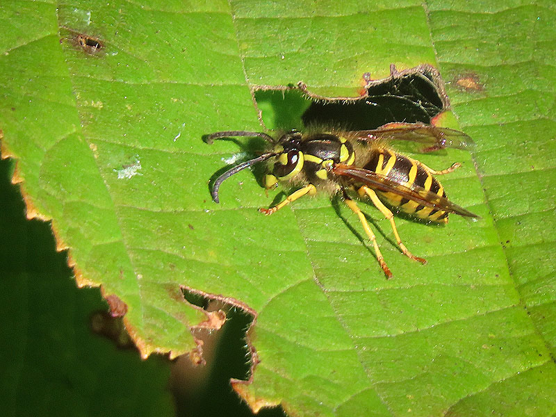 Eastern Yellowjacket (Vespula maculifrons). I see these exploring upper leaf surfaces lately. I wonder what they're up to.