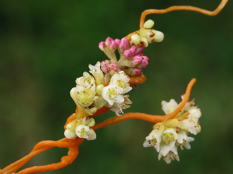 Dodder (Cuscuta gronovii) and parasitic vine with orange stems. The white flowers are of the Dodder; the pink of the plant it was twining over.